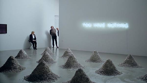 電影中不免微微的戲謔一番「藝術」,但我相信這不完全是導演的本意,藝術的出發點絕對源自於人性,是否每個人理解藝術,我認爲,無解。但片中有個展覽,印象深刻,放置了無數的小石堆,牆上寫著「you have nothing 」你一無所有,我倒認為,正解。